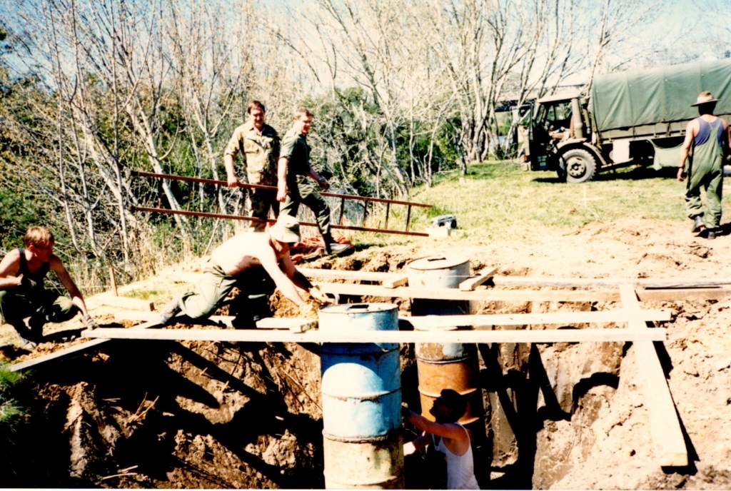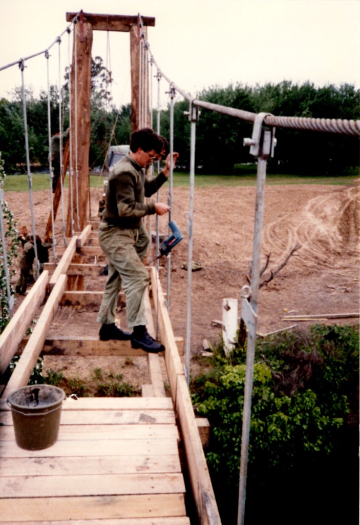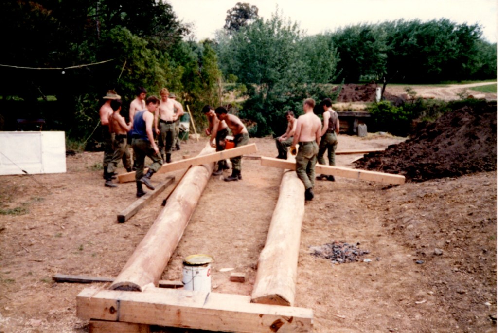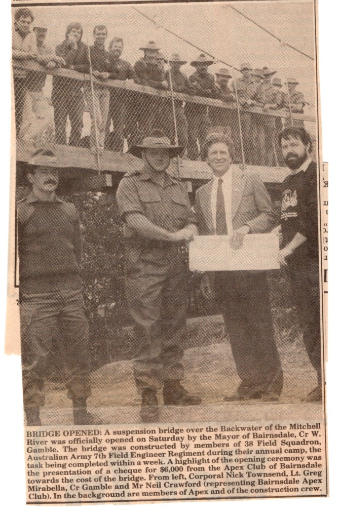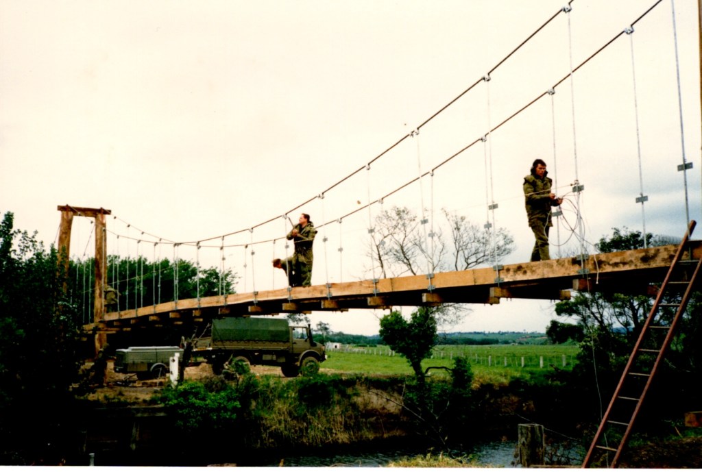 That Backwater Suspension Bridge was originally constructed by 8 Field Squadron, 7 Field Engineer Regiment in 1989. After major floods in the area in 1990 the bridge needed to be reconstructed, this time the job was carried out by 38 Field Squadron in 1991.