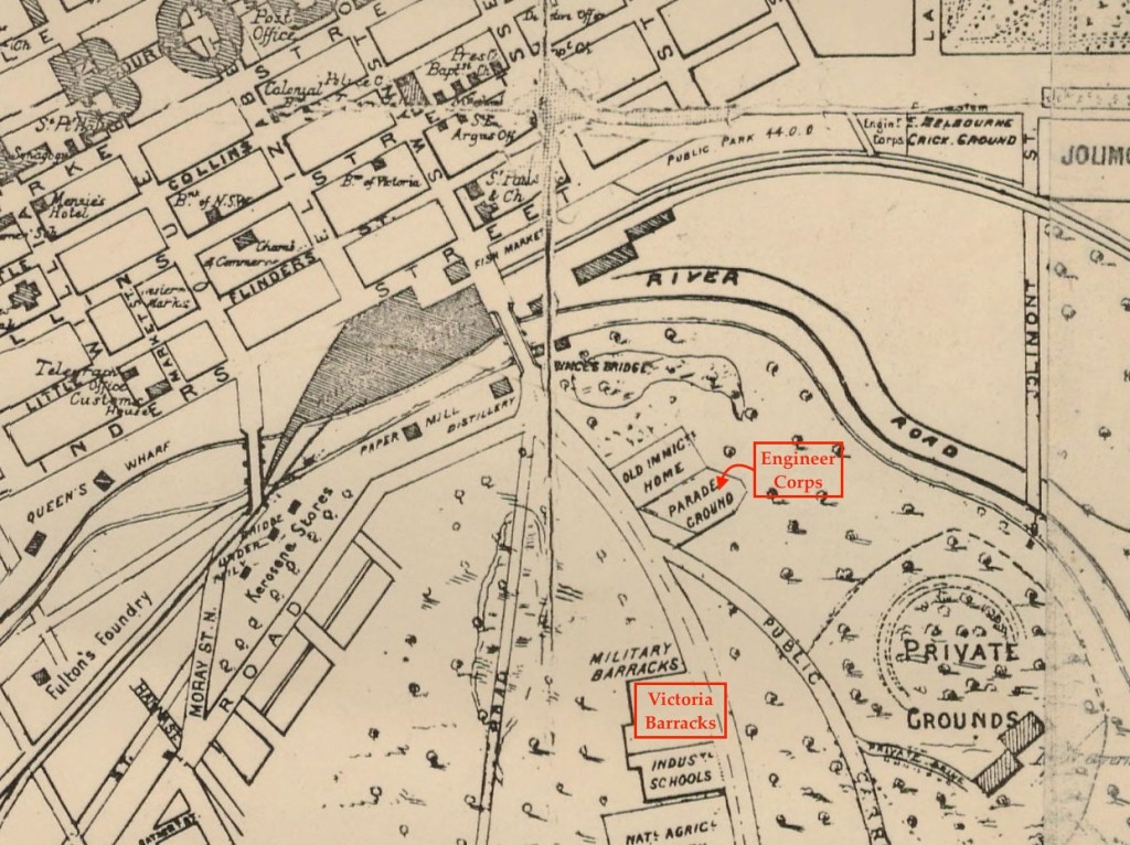 Sir Peter Scratchley gave instruction to members of the Engineer Corps held their early parades at a temporary barracks that were built in 1852 for the 40th Regiment (Infantry). The barracks were located on the East side of St Kilda Rd on a site that now forms the Queen Victoria Gardens.