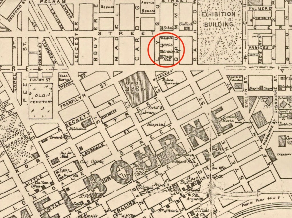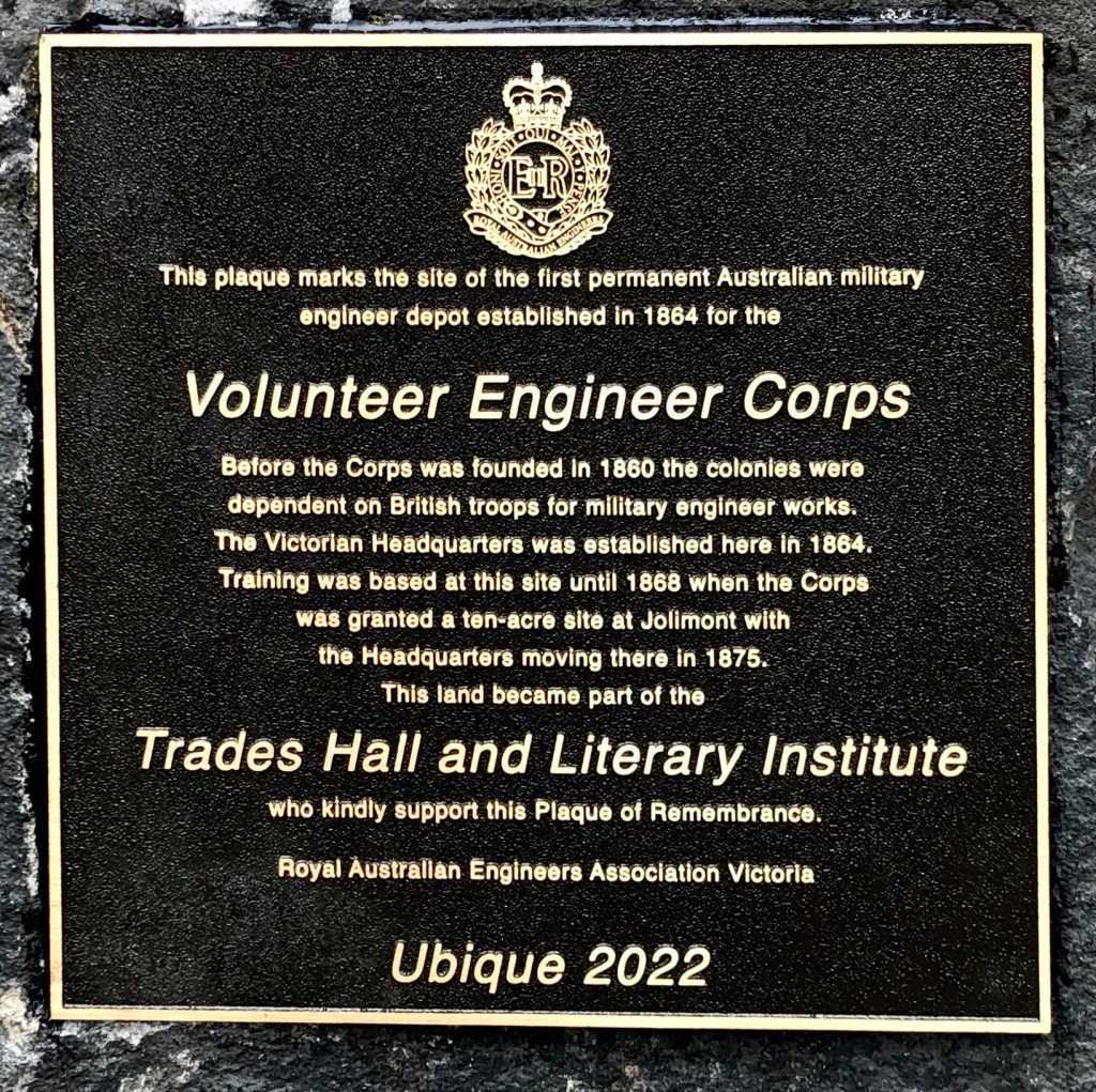 For the period 1864-1877, the Victorian Volunteer Engineer Corps is listed in those annual Melbourne and Suburbs Street Directories as occupying a acre allotment in Lygon Street Carlton. At that time it adjoined the Northern boundary of the then Trades Hall Literary Institutes 10 acre Crown Grant, situated the North East comer of Lygon and Victoria Streets. The training depot was built by the unit of volunteers and was usually termed the orderly room, a building 50 Feet by 25 feet, which cost £300. In 1867 the Corps extended the Lygon Street training depot by 10 feet adding a small room for committee meetings.