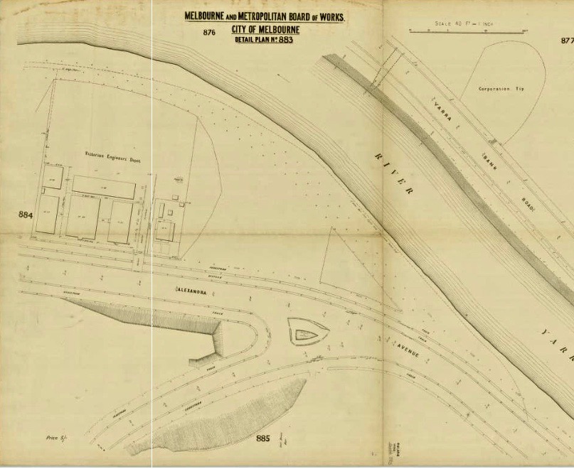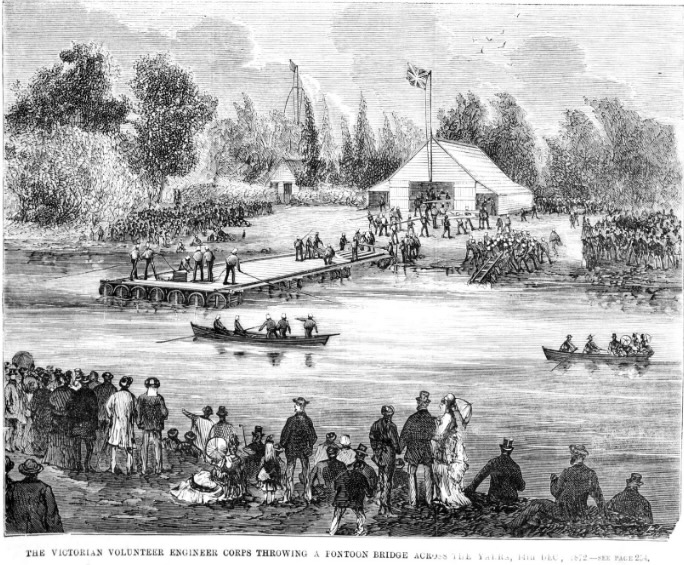 1869, an Engineer pontoon shed was built on the South bank of the Yarra downstream from Princess Bridge for watermanship and bridging training.