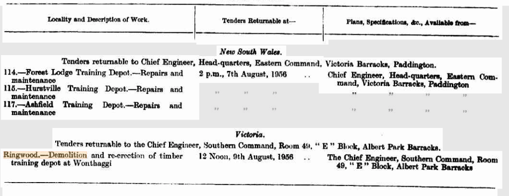 1953 – An area of land on Dublin Road East Ringwood that was the site of the Ringwood Brick Making Company was obtained by the Defence Force for a new Depot.