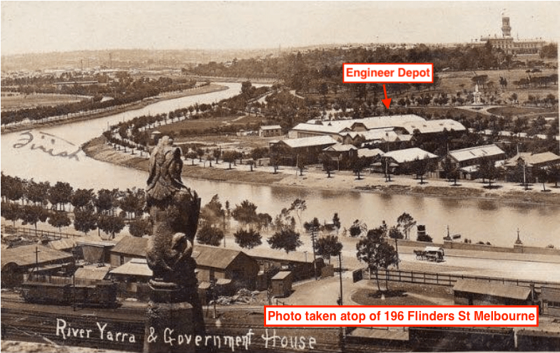 In 1876 the Engineer shed next to Princes Bridge was removed by the Government in order to make room for the embankment of the ornamental lake which forms a portion of the Government House domain. The shed was re-erected and enlarged on the other side of the Yarra adjacent to CPT Lonsdale’s old house in Jolimont, that was now being used by the Victorian Engineers HQ as an Orderly room after moving from Lygon Street in 1868.