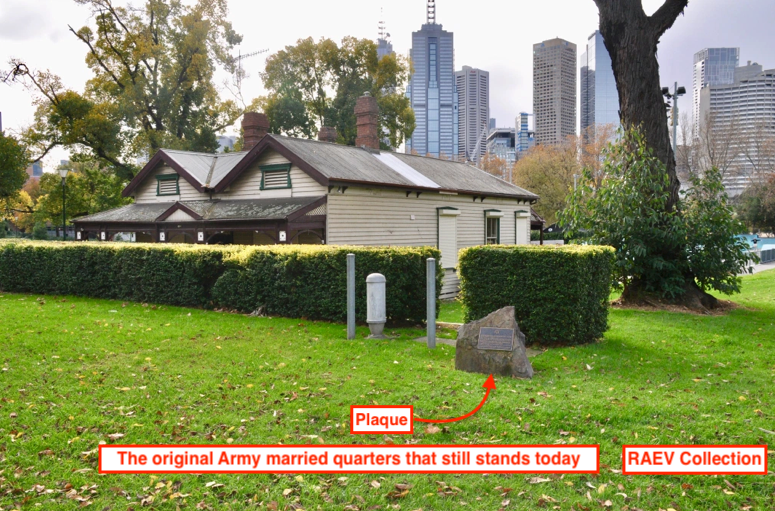 This had originally been Capt Lonsdale’s house till 1854 which was a prefabricated house built by the Royal Engineers in Sydney and shipped to Melbourne. It was used as the Corps HQ. There was a horse paddock, parade ground and training area.