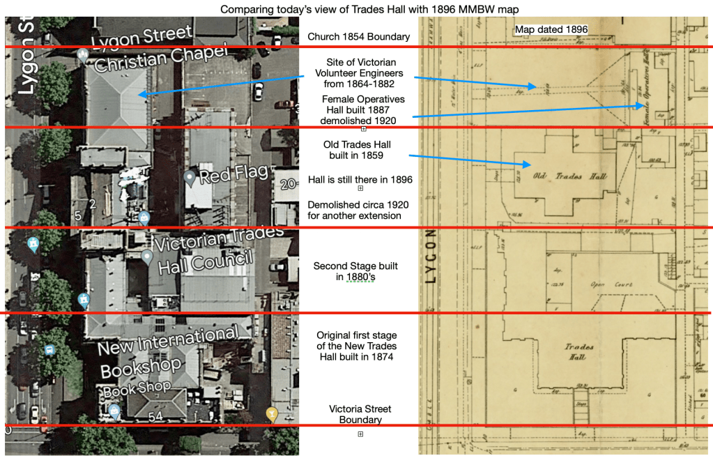 During 1887 the Trades Hall and Literary Institute was granted a Crown title to this ¼ acre site for the construction of a female Operatives Hall. During the 1920’s this was demolished to enable an extension to Trades Hall building to be undertaken.