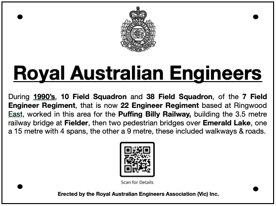 The RAE Association (Vic) have created Heritage Marker Trail. The Heritage Marker consists of a stainless steel plaque with a description go the site and a QR code for access to more details, photos etc. These plaques are mounted to the top of a treated pine post or similar. Since 2018 these markers have been erected at sites of historical significance that showcase the work done by Victorian Sappers in Victoria.