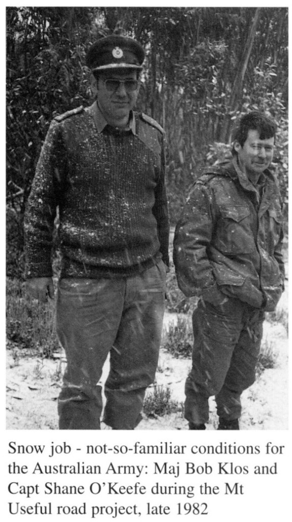 Bearing the brunt of the elements, 105 Construction Sqn under Maj Bob Klos, built a 4km access track through the snow gums to the Mt Useful lookout.