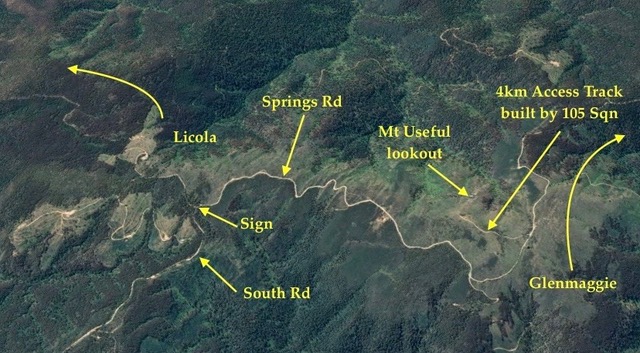 From the Glenmaggie camp, 107 Plant Sqn commanded by Capt Howard Ellis built 12km of road on Black Spur Range, The Forests Commission supplemented the CRB skills by providing a D7 Dozer with a tree pusher.