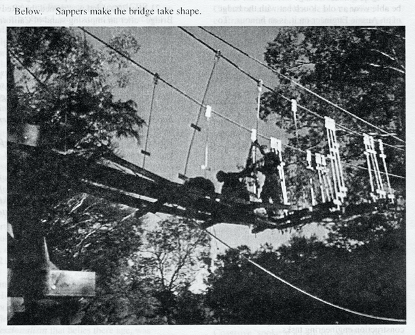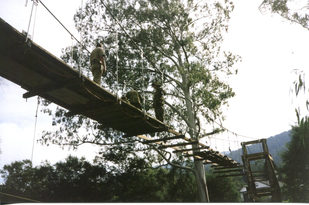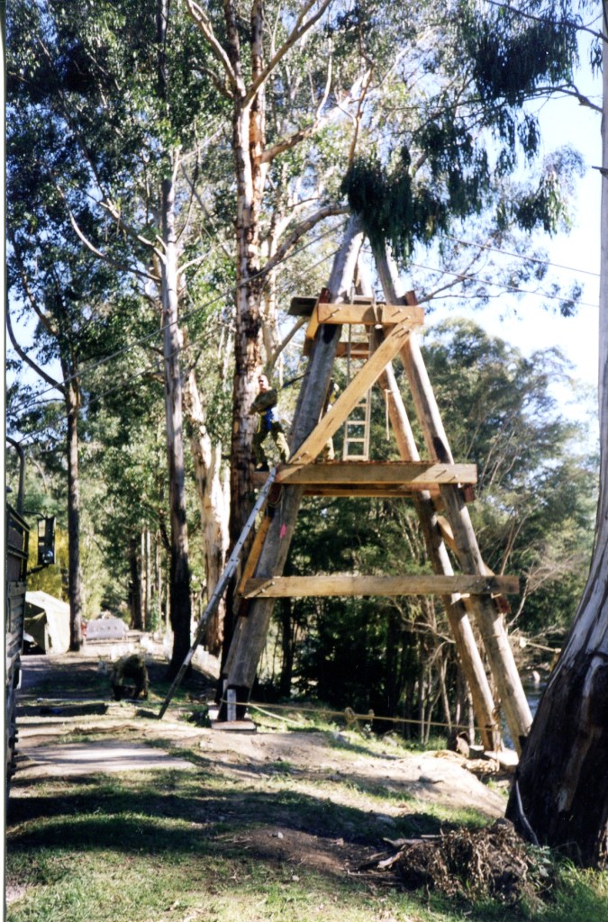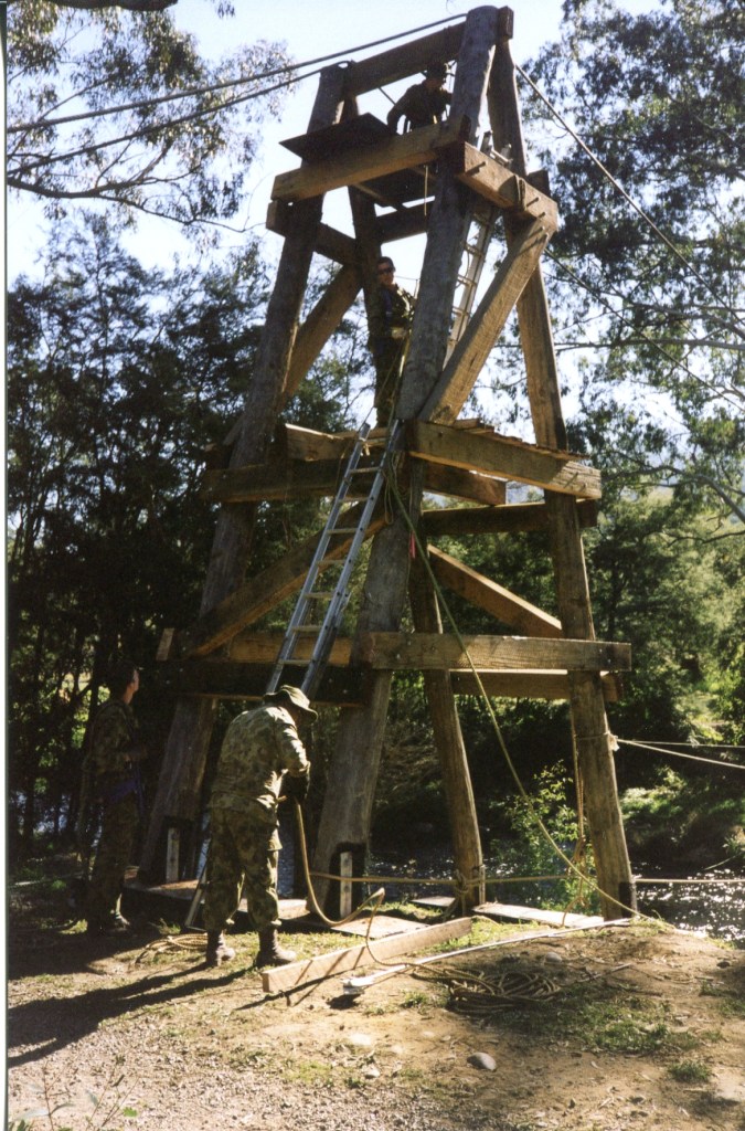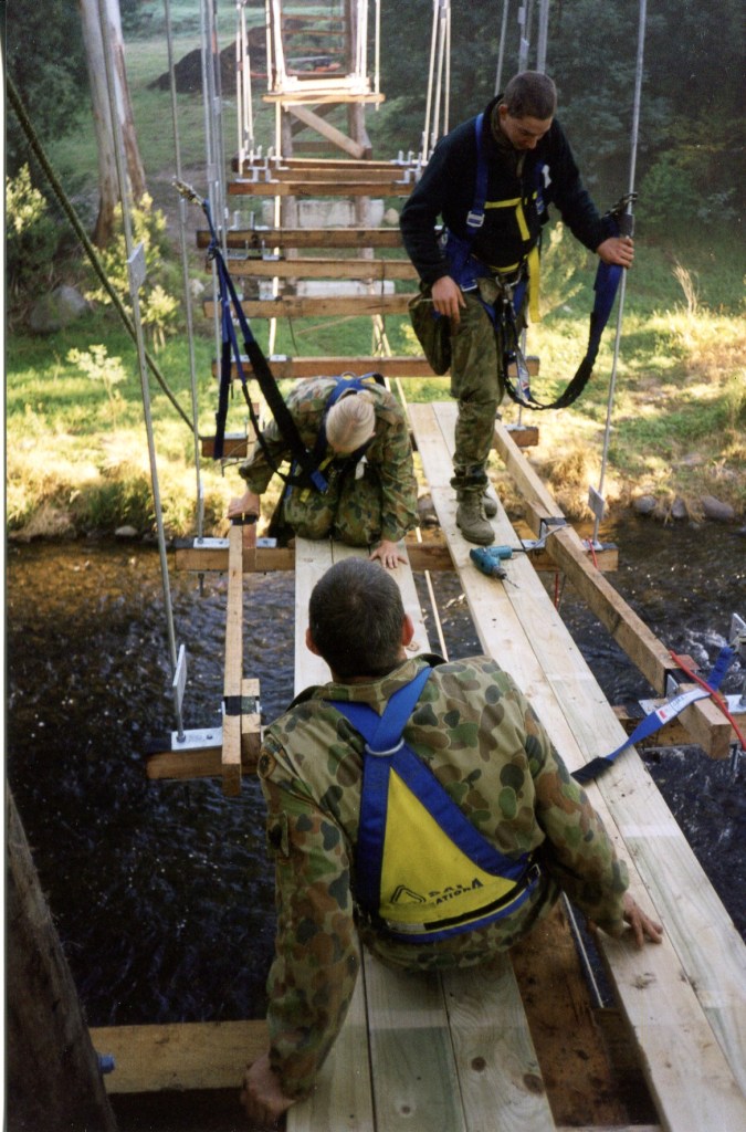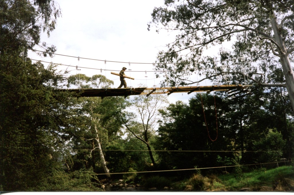 In 1998 the Warburton Advancement League approached 4CER to construct a footbridge over the Yarra River to connect two walking trails in this beautiful township 100km east of Melbourne. This was a great practical and real task for a vibrant and revitalised unit who were generally used to constructing more expedient tasks. The unit found themselves involved in producing a substantial permanent suspension bridge designed to withstand a 100-year flood!