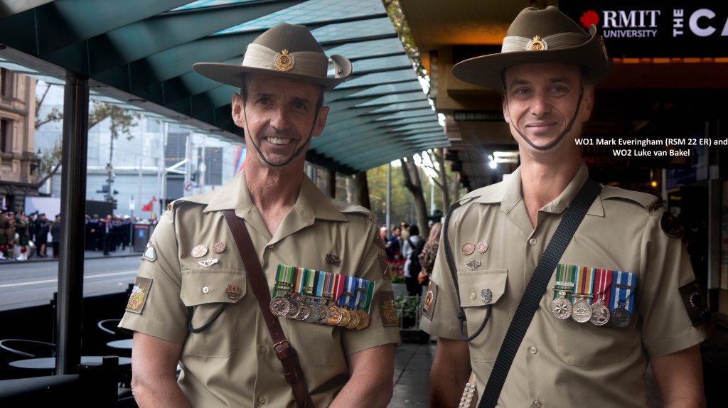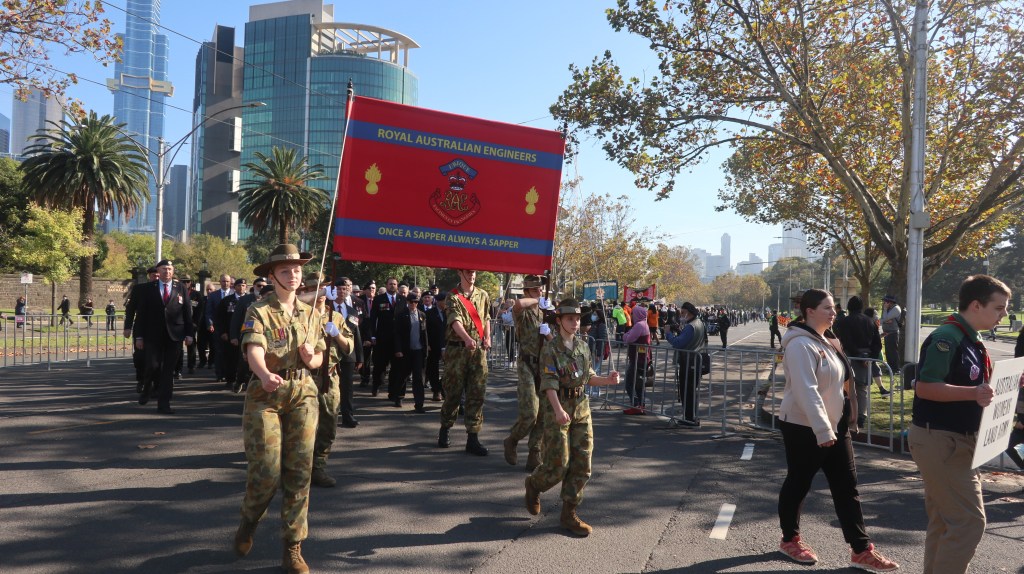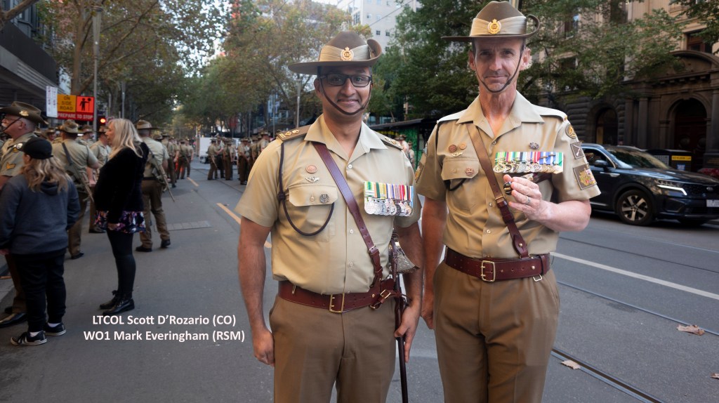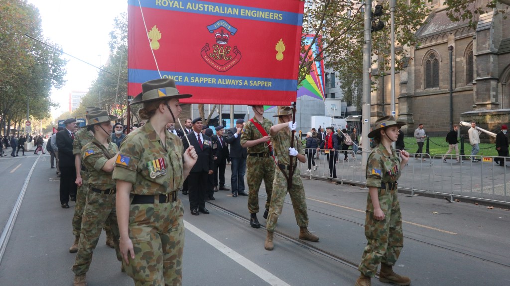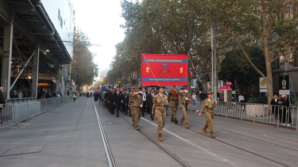 This year the 22nd Engineer Regiment conducted a Dawn Service at Oakleigh prior to departing to participate in 4th Brigade city march. Timing for all those participating in the city march were very tight which did not allow the Regiment to conduct a “gunfire” breakfast or complete other formalities such as inviting families and friends or having local dignitaries lay wreaths. By conducting a Dawn Service the Regiment acknowledged the purpose and objective of the day and that is to remember those men and women who paid the supreme sacrifice. I believe that the Regiment was the only Unit within the Brigade to hold a Service.