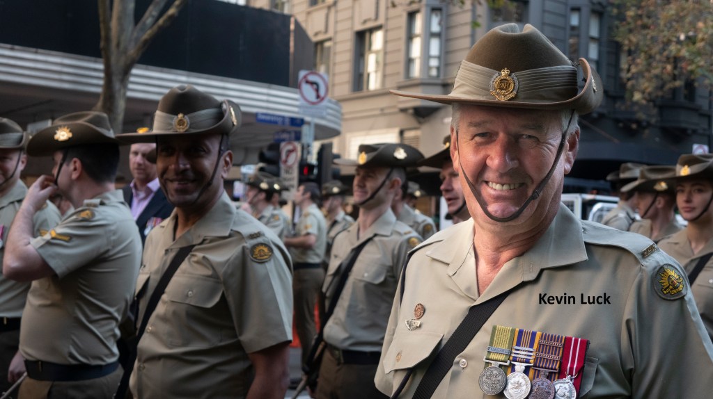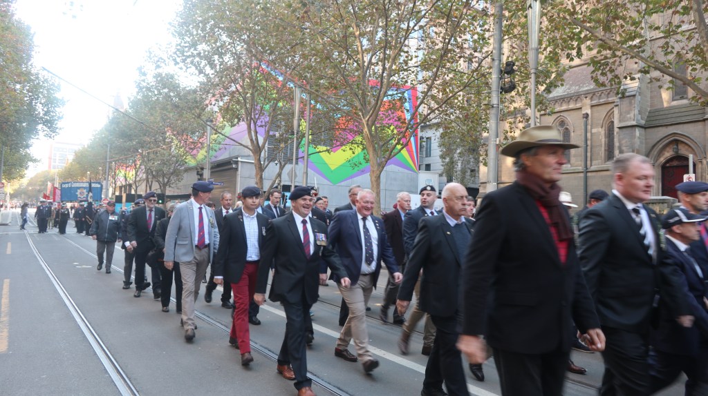 Once again the Association agreed to participate in the ANZAC Day march but our step off time and location were different from last years – this year our FUP was in Collins Street East with step off at 10.10 am (according to MUFTI) but bearing in mind the events of the last few years where we stepped off early everyone was advised to be in place by 9.30 am. I spoke to the Chief Marshall for the area and he (a LTCOL) assured me many times that we would step off as advised but at a little after 9.30 am we were being rounded up by a very angry female SGT from Navy who would listen to nobody and directed us to move into the parade some 25 minutes early – by stepping off early a few people missed out on this privilege of marching. We had the Cadets in place and banner ready well before the scheduled step off so we were OK.