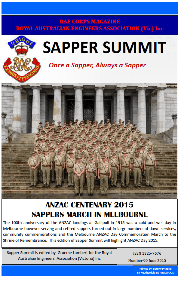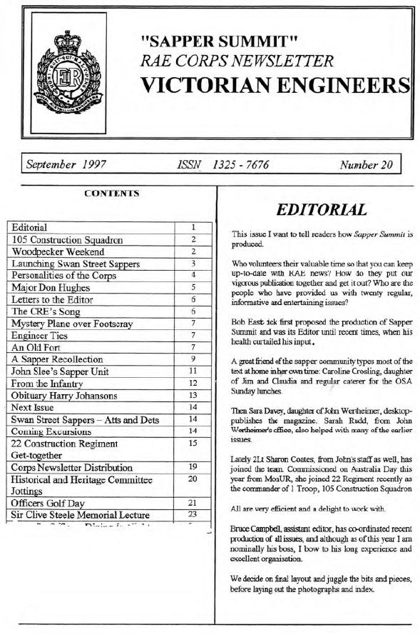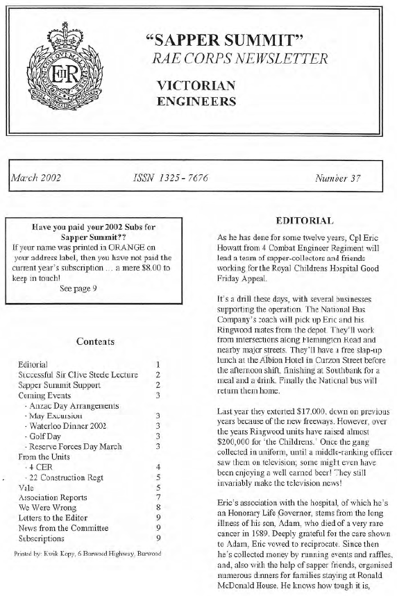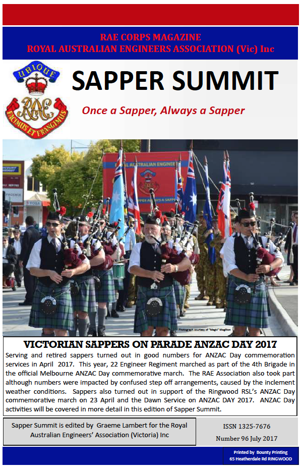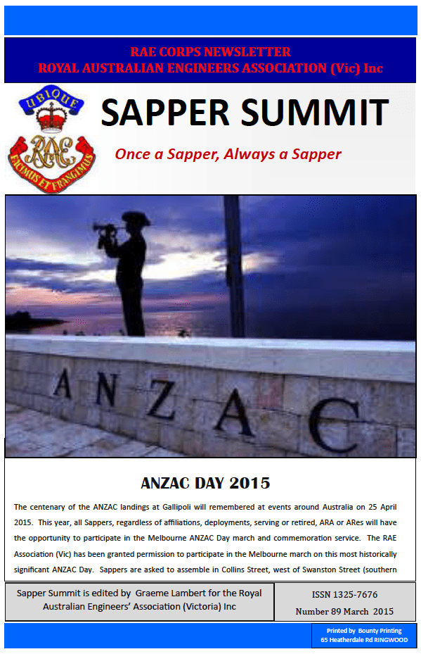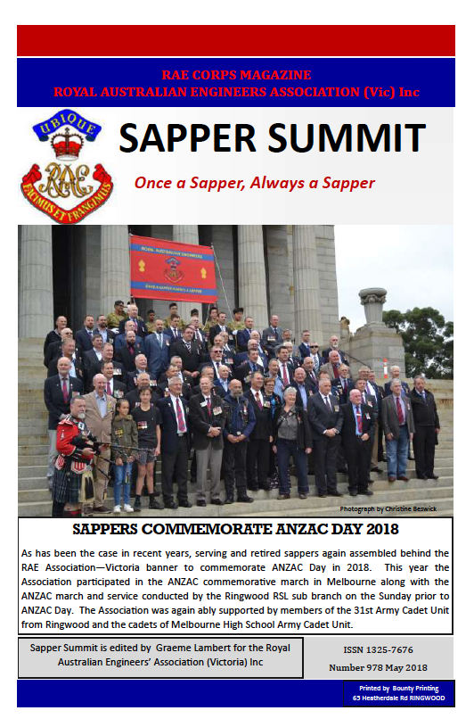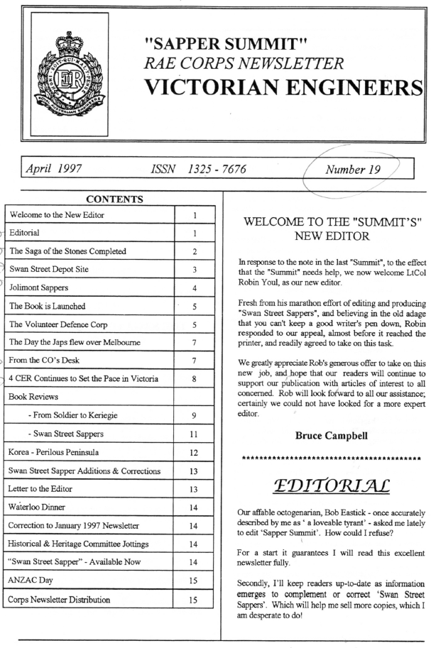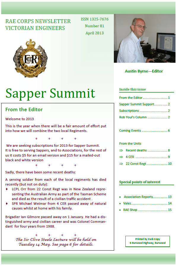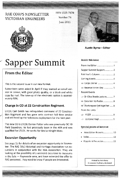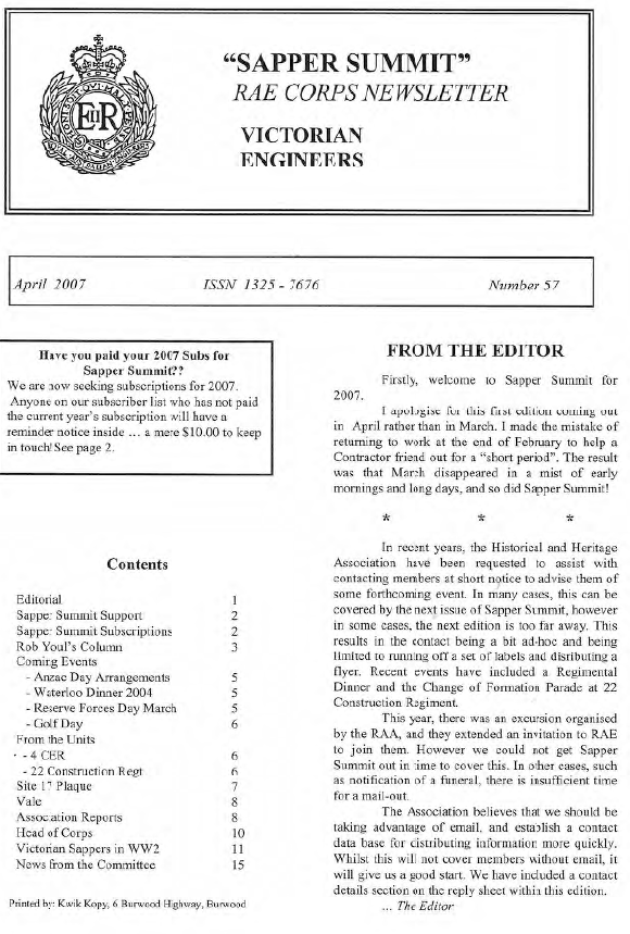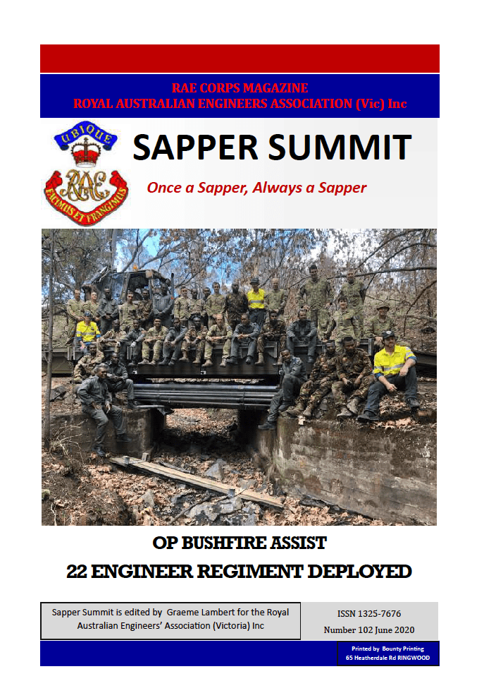 If you have anything to contribute, please contact the editor by email at sappersummit@raevictoria.com. or P.O. Box 246 Ringwood East, Vic, 3135.