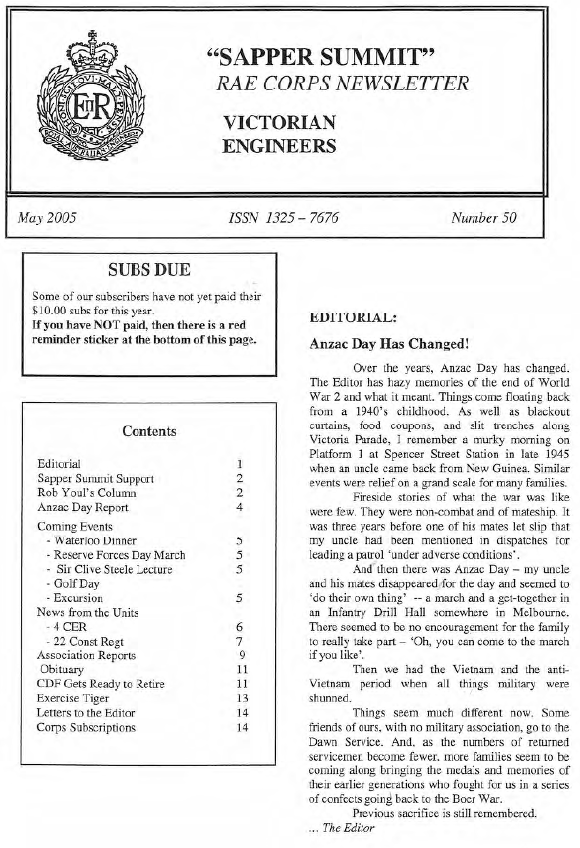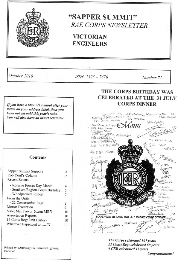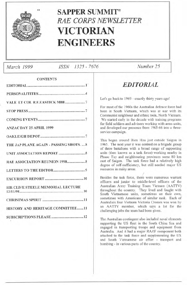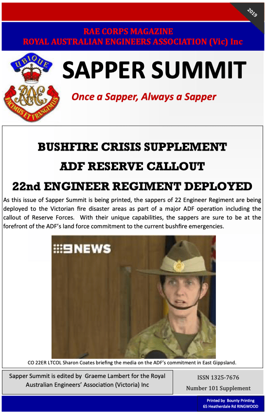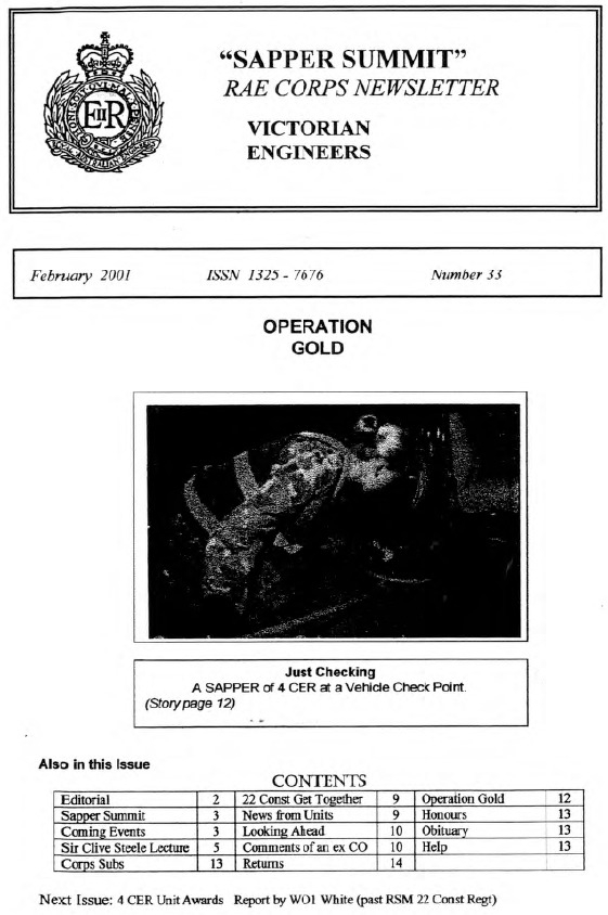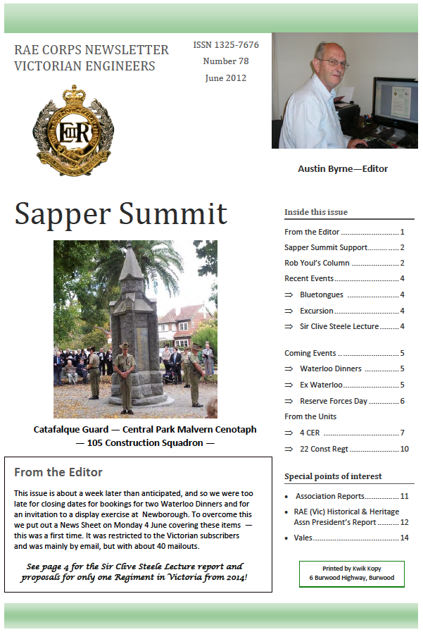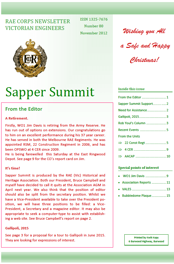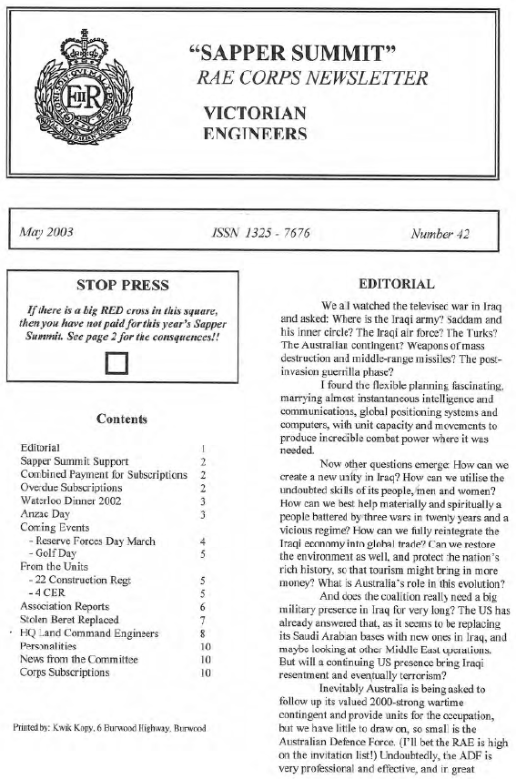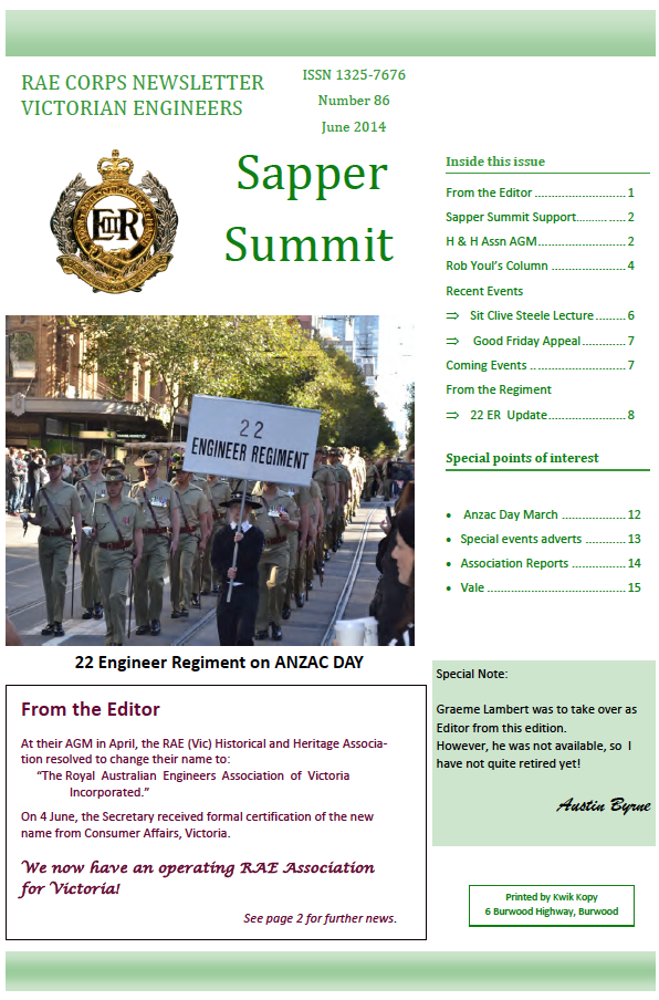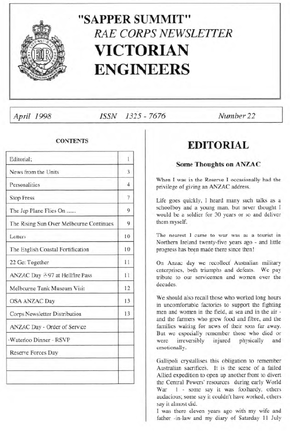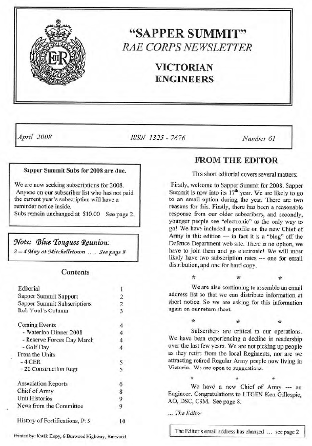 If you have anything to contribute, please contact the editor by email at sappersummit@raevictoria.com. or P.O. Box 246 Ringwood East, Vic, 3135.