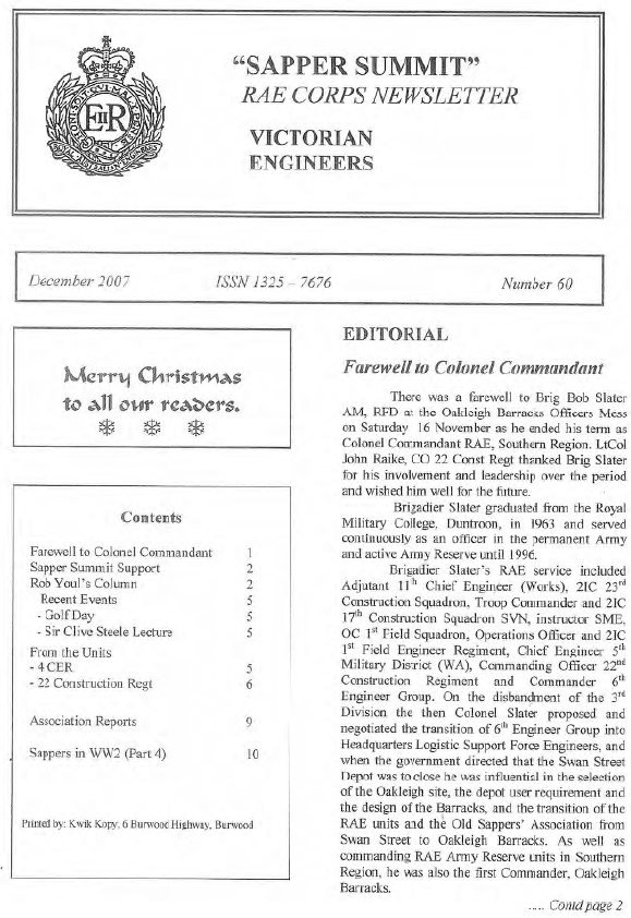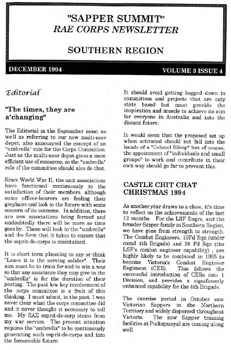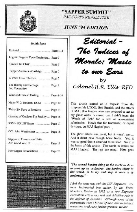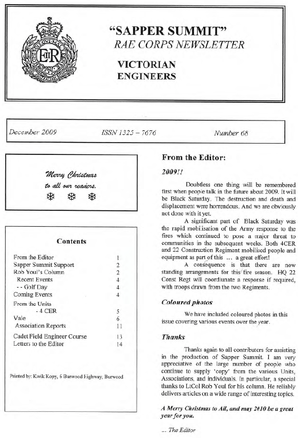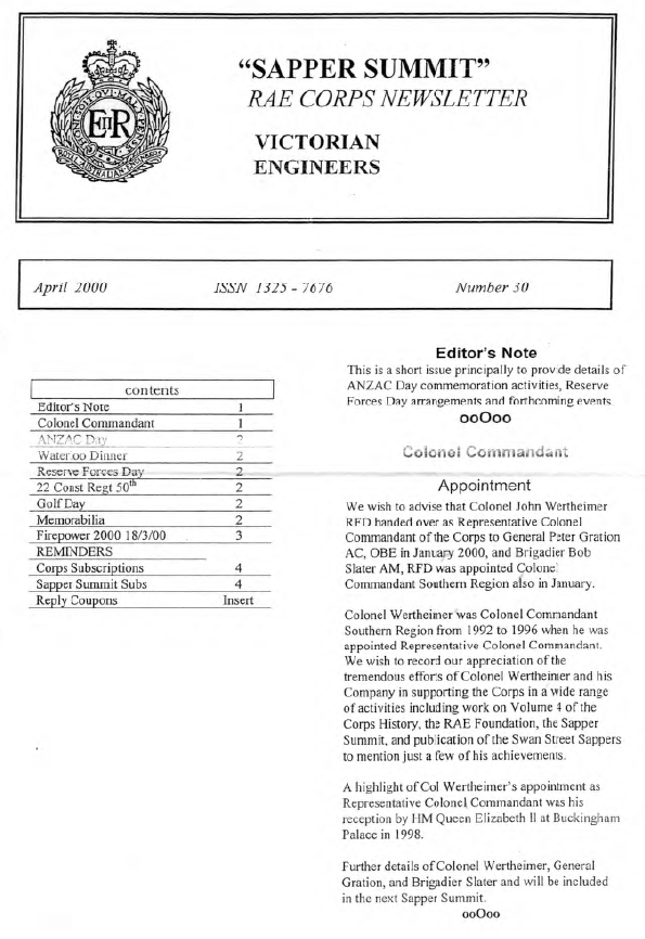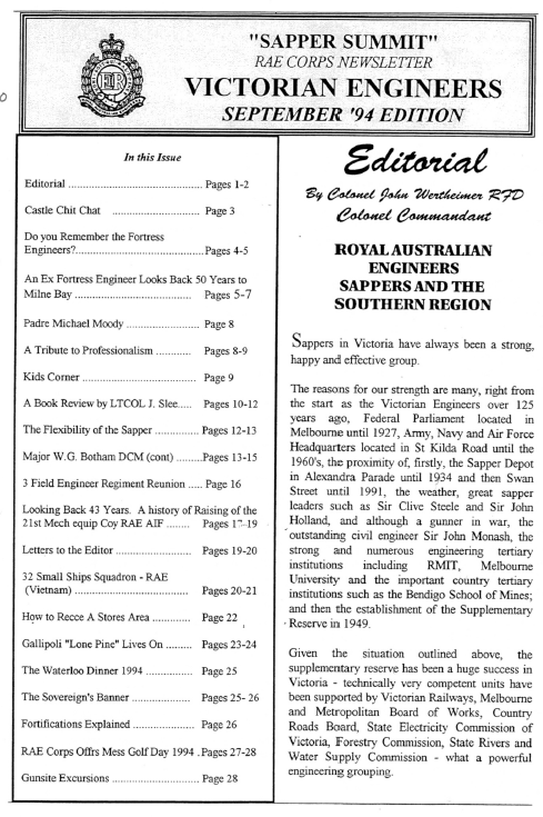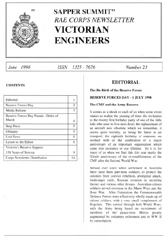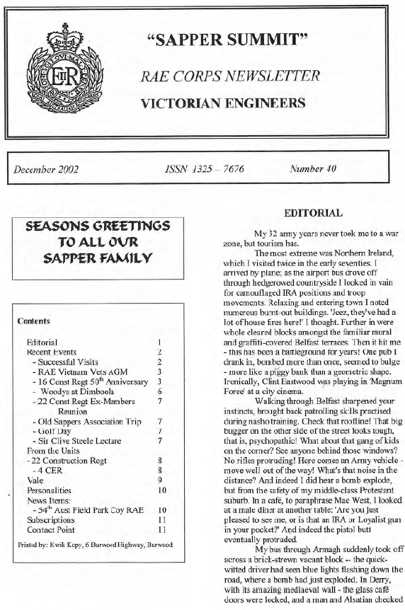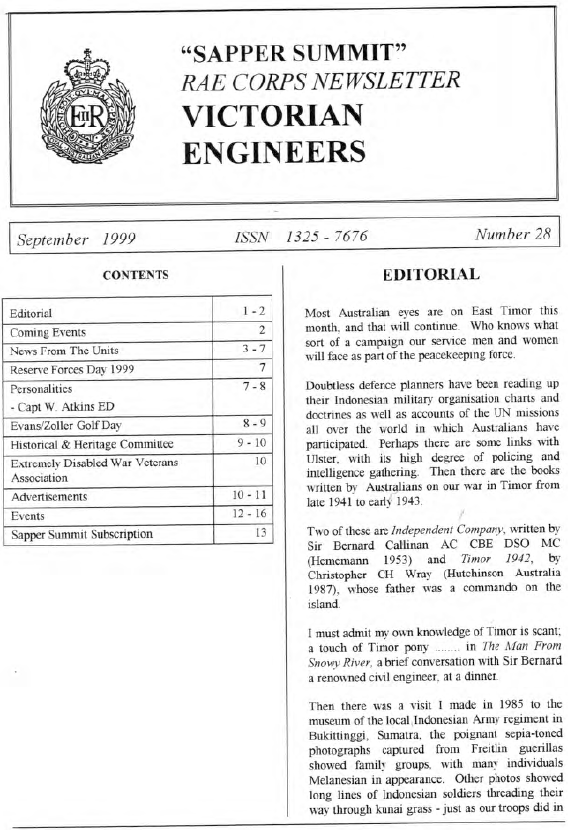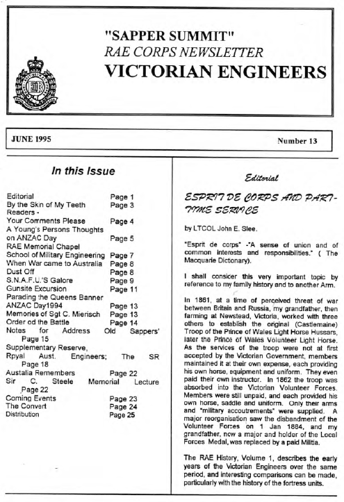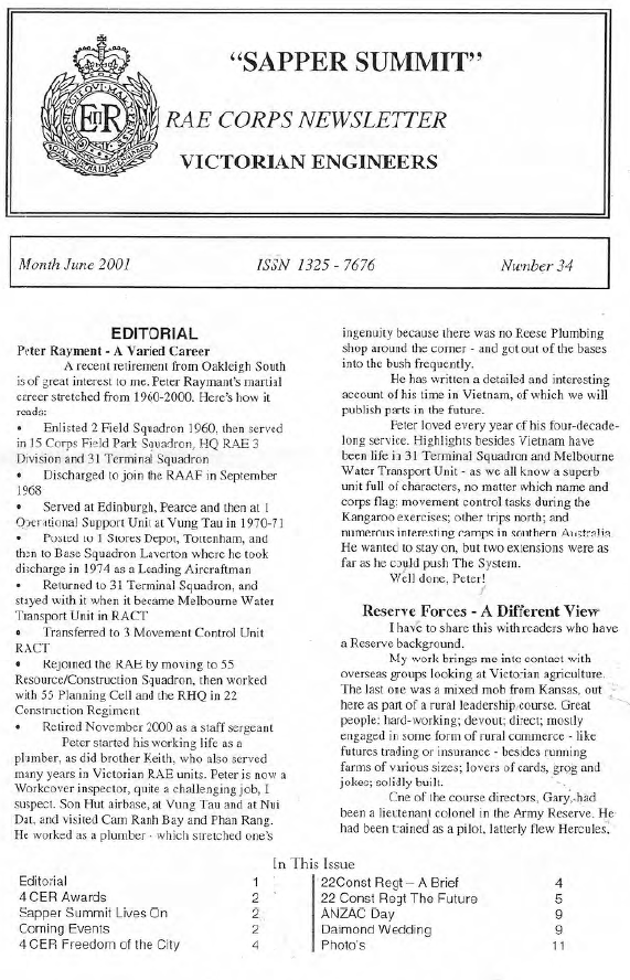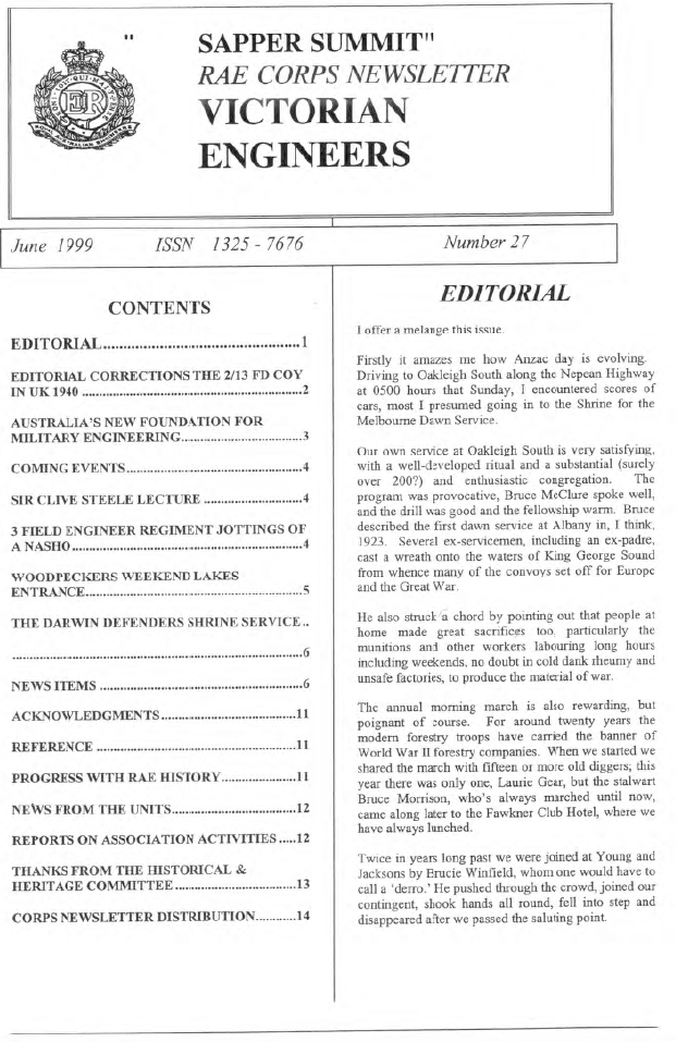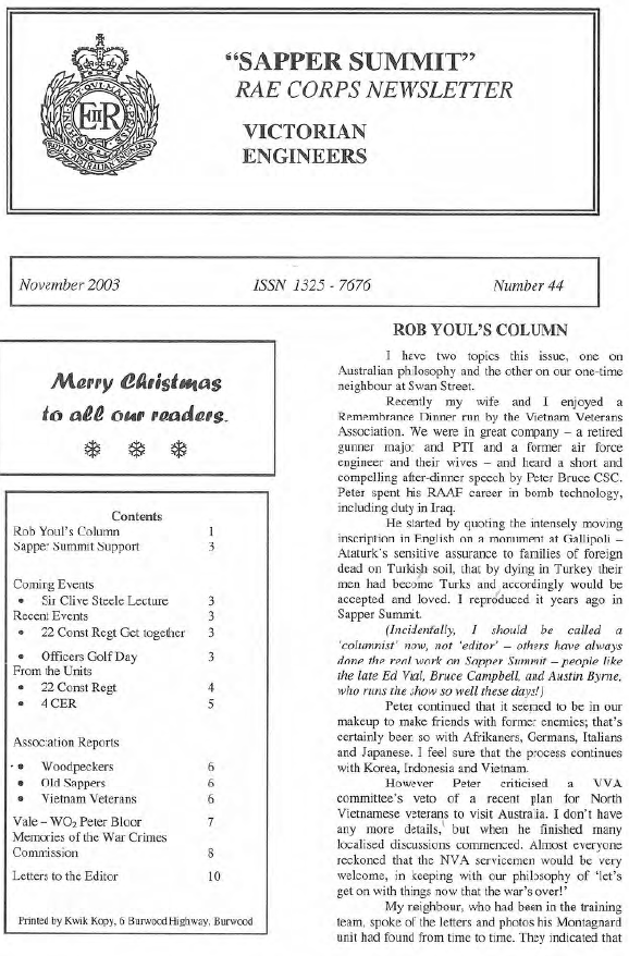 If you have anything to contribute, please contact the editor by email at sappersummit@raevictoria.com. or P.O. Box 246 Ringwood East, Vic, 3135.