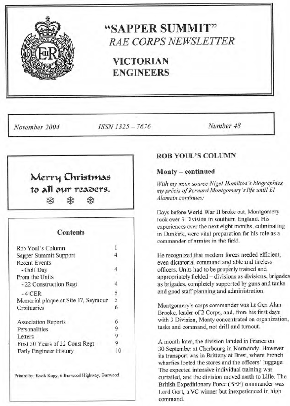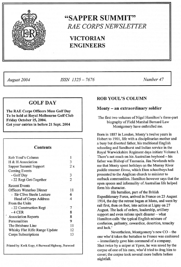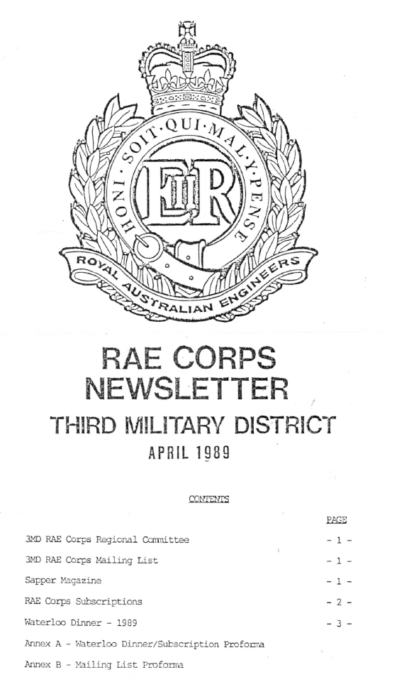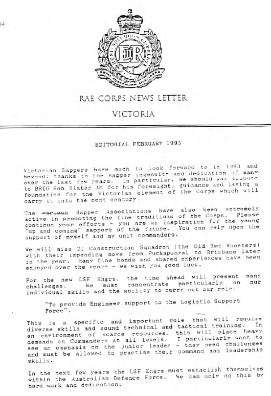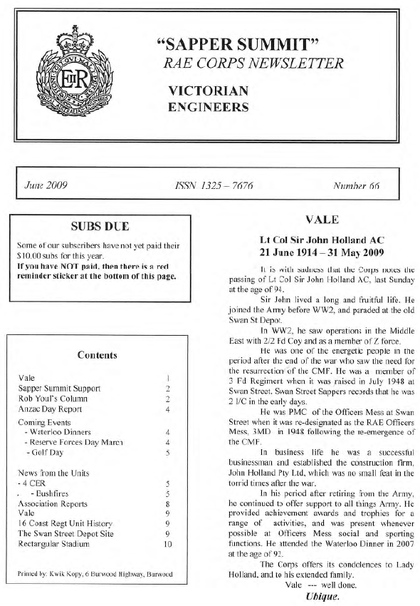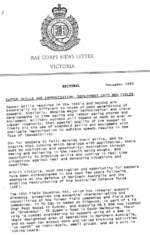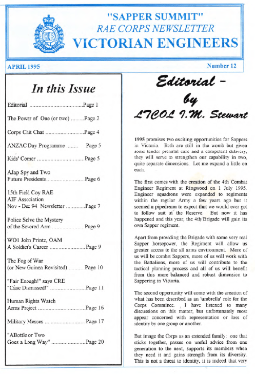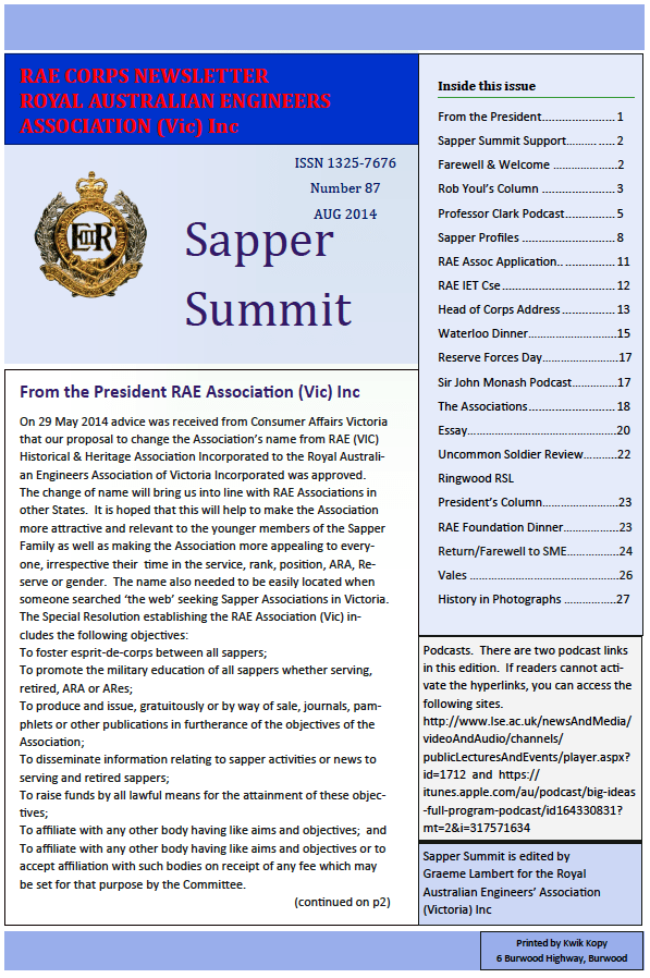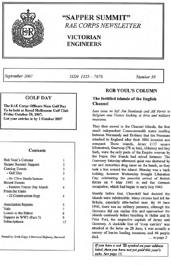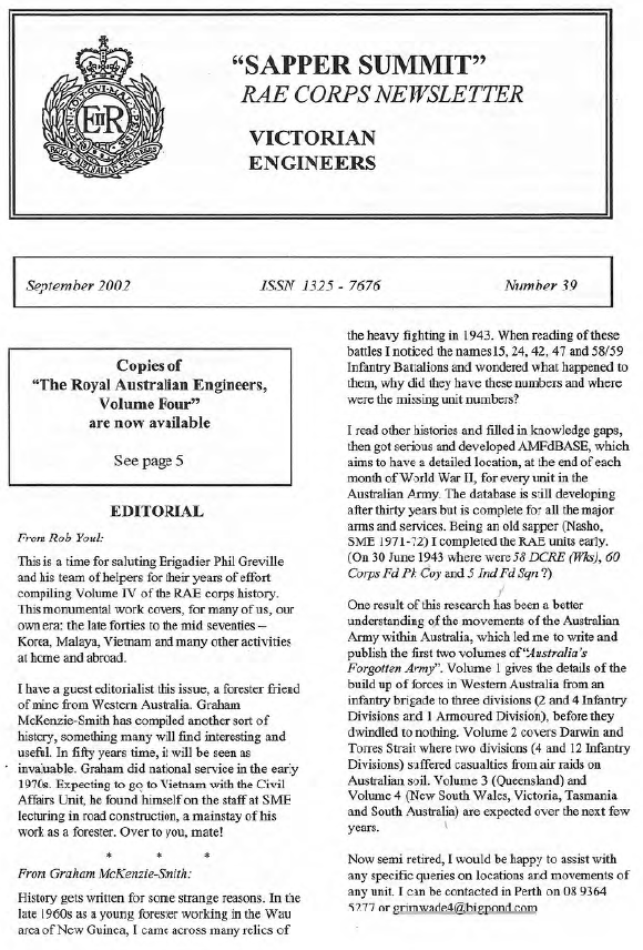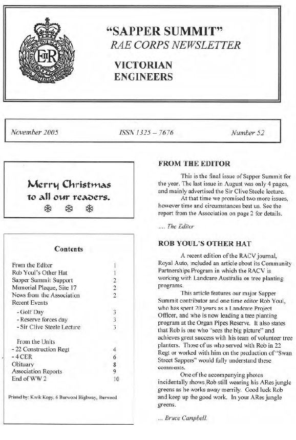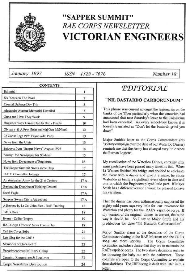If you have anything to contribute, please contact the editor by email at sappersummit@raevictoria.com. or P.O. Box 246 Ringwood East, Vic, 3135.